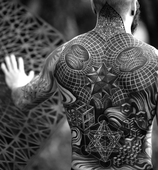 La précision mathématique des lignes fusionne avec l'expression personnelle du tatoueur, qui interprète le style néo-géométrique de plus en plus