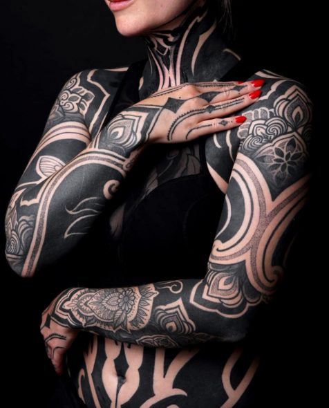 Tatouages noirs raffinés, caractérisés par des lignes douces et harmonieuses qui coulent naturellement le long du corps – ce sont